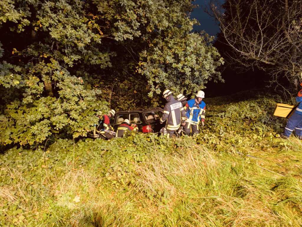 Fahrzeug im angrenzenden Hangbereich in steilem Gelände befand und zwei Personen eingeklemmt waren. Zur Rettung der „Verunfallten“ kam hierbei unter schwierigen Umständen schweres technisches Gerät zum Einsatz. Darüber hinaus galt es zur Sicherstellung einer ausreichenden Löschwasserversorgung eine entsprechende Schlauchstrecke zu einem weiter entfernten Hydranten zu verlegen.